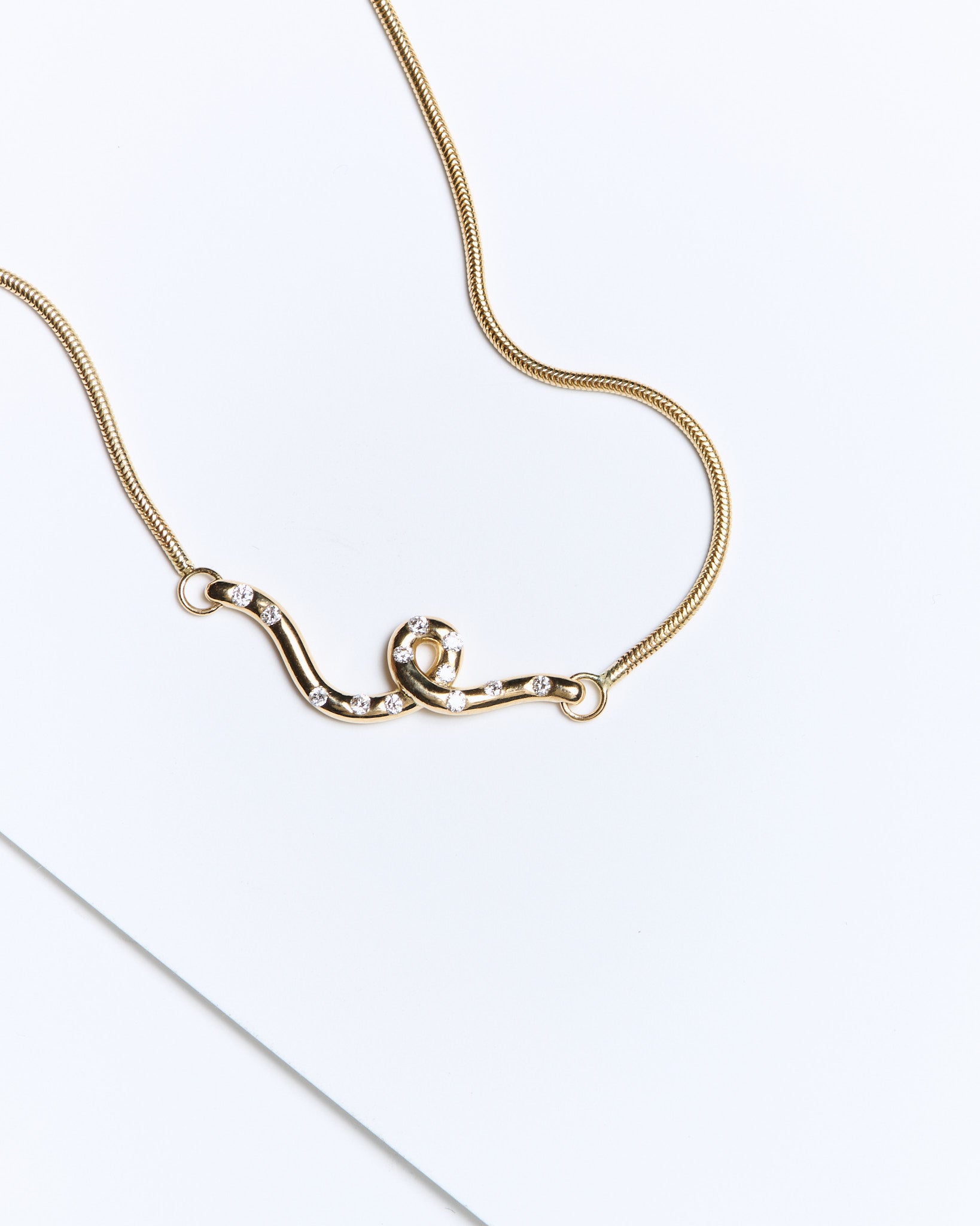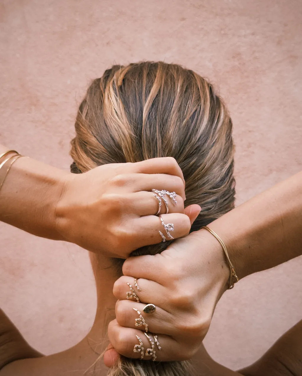 Sur la bague Custom 00, une pierre à choisir au showroom, apporte une profondeur plus sensuelle. Parmi la sélection coup de cœur de la créatrice, chaque cliente a le pouvoir de se créer une bague unique qui lui ressemble. Presque en suspension entre deux doigts, elle s’ancre avec poésie et contraste avec la vivacité des diamants qui l’entoure. Sa silhouette générale prend une allure organique que souligne son asymétrie, sa modernité, et sa fluidité. Toutes les bagues s’enroulent autour du doigt sans jamais l’écraser : une ligne principale, puis cette signature de la Maison, la petite boucle lumineuse sertie qui semble en apesanteur au-dessus de la peau. Les boucles d’oreilles reprennent cette écriture distinctive : un départ twisté, ligne articulée de petits diamants sertis et une goutte finale qui trace un mouvement vertical très féminin et aérien. Épurés jusqu’à l’essentiel les bracelets et colliers épousent la même esthétique. On y retrouve cette sensation de mouvement qui traverse toute la collection : une ligne qui avance, se plie, se relève, comme un tracé à l’encre devenu bijou.